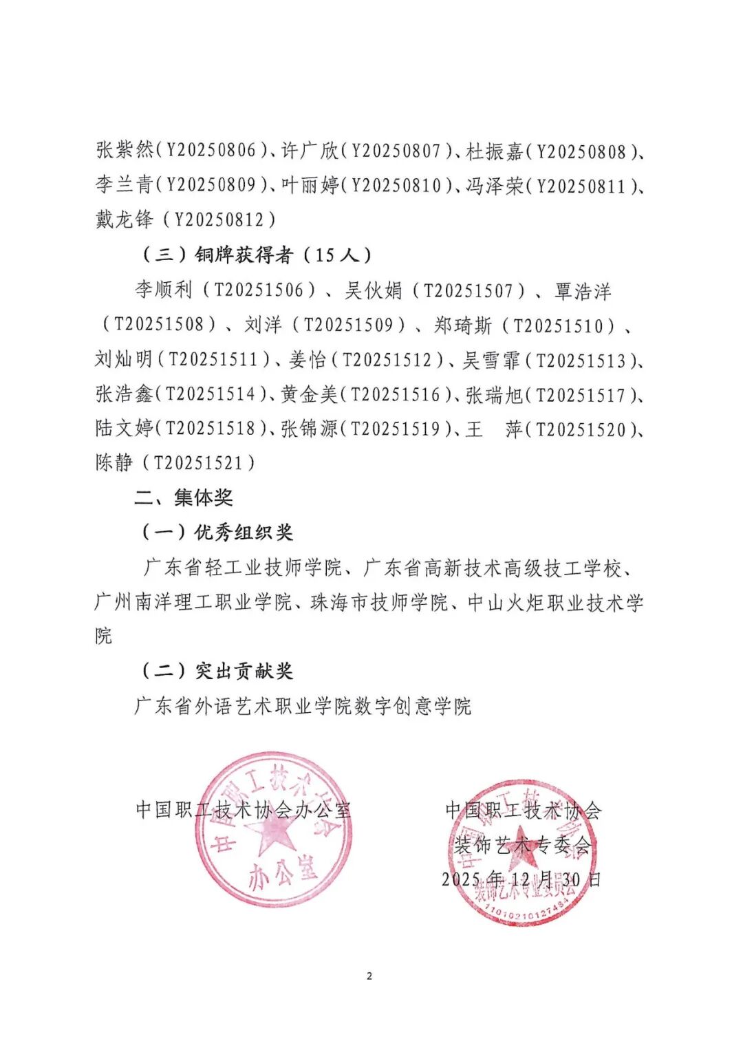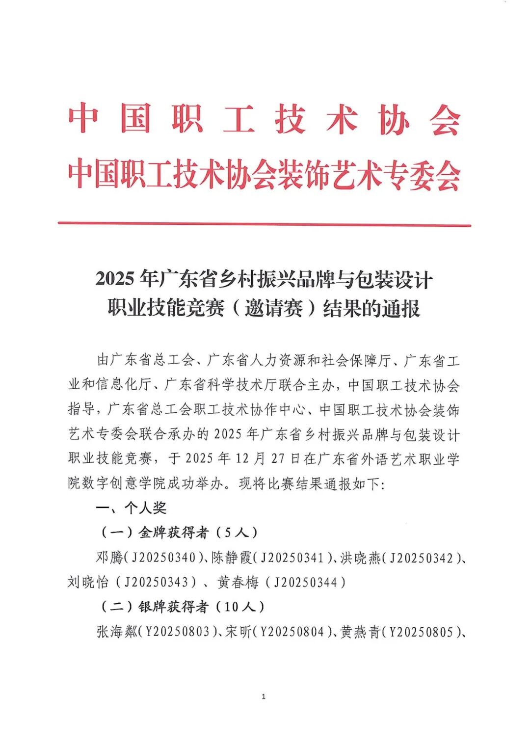 中国职工技术协会关于2025年广东省乡村振兴品牌与包装设计职业技能竞赛金银铜奖牌结果通报